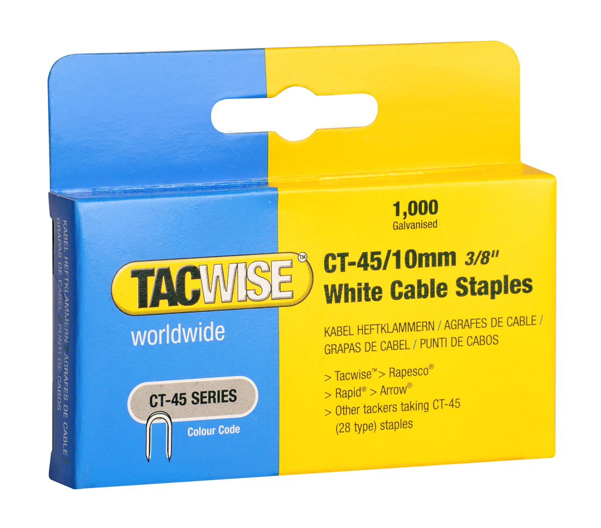 5 x 1000 sztuk zszywek do kabli typ CT-45 o długości 10 mm w kolorze białym.