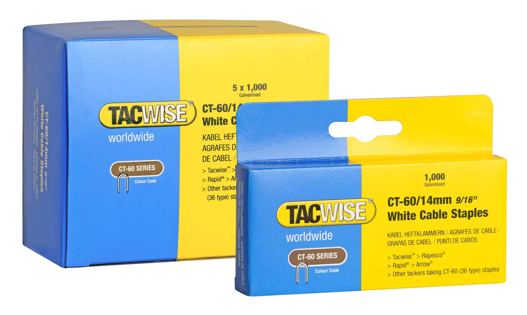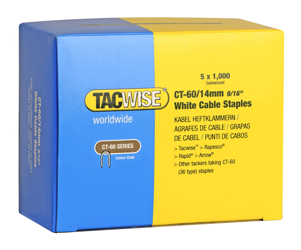 5 x 1000 sztuk zszywek do kabli typ CT-60 o długości 14 mm w kolorze białym.